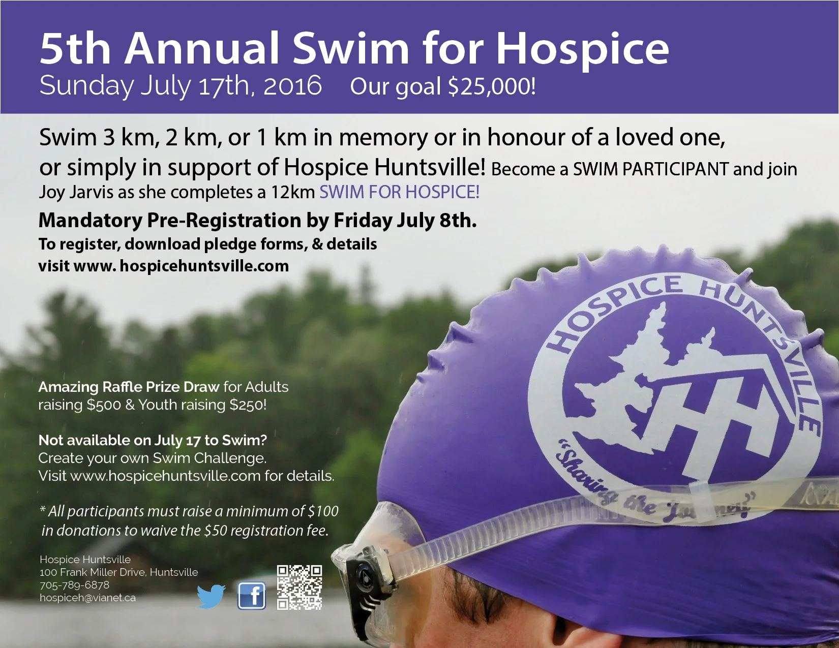 Become a SWIM CHALLENGER and challenge yourself to swim 1km, 2km, or 3km to raise money and to raise awareness for Hospice Huntsville. Join us on Sunday, July 17th at the Town Docks in Huntsville! Mandatory Registration by Friday, July 8th by phone or email.