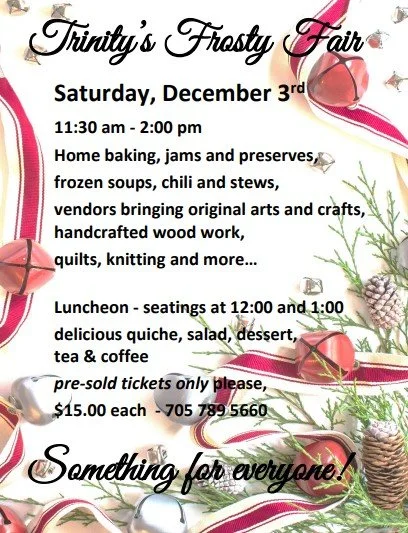 Come out to enjoy the Frosty Fair at Trinity United Church, Huntsville on Saturday, December 3rd from 11:30 – 2 pm.