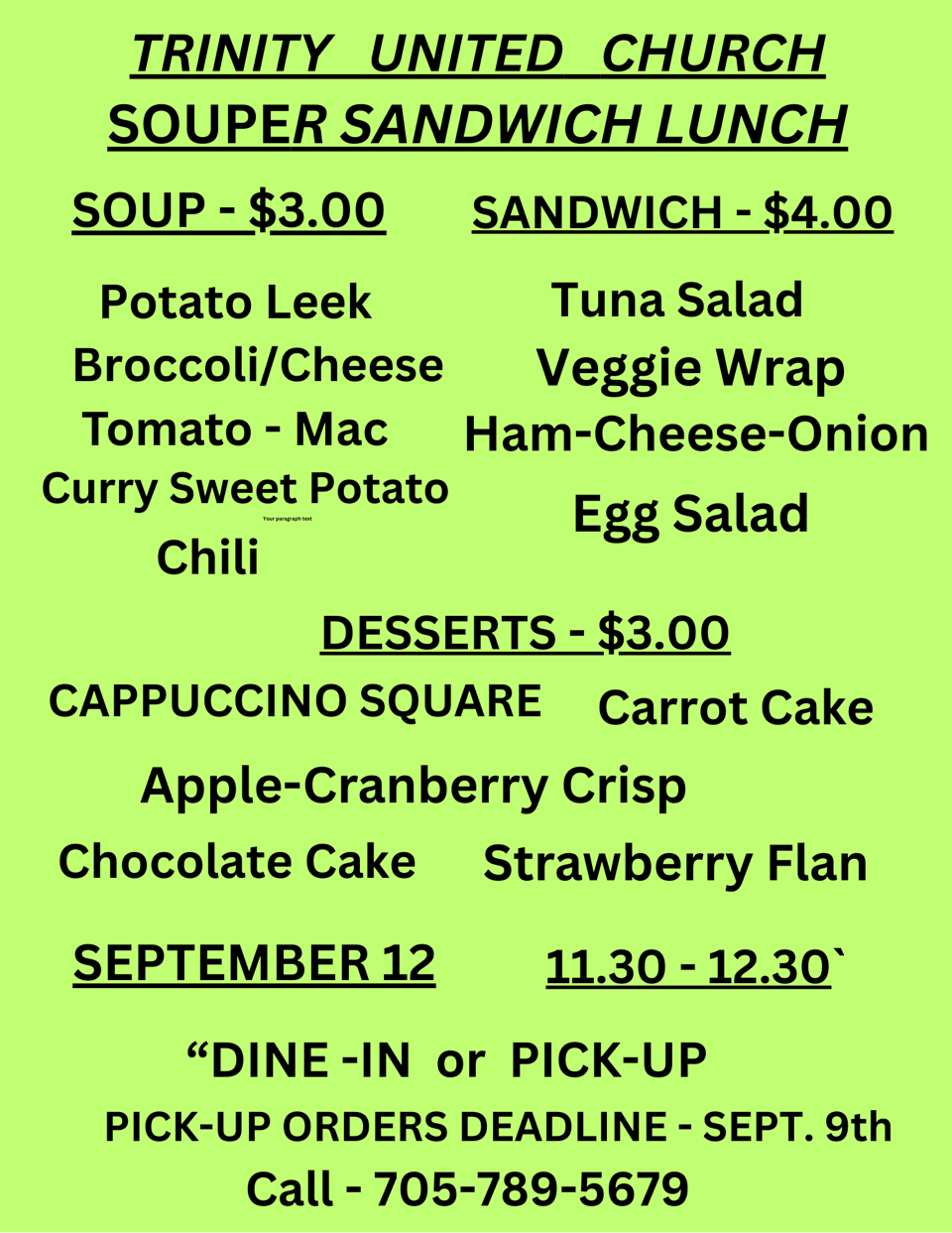 Or…. order take-out by Tuesday, September 9th at 705 789 5679, to pick up Friday, September 12th; 11:30 - 12:30 at Trinity United Church.